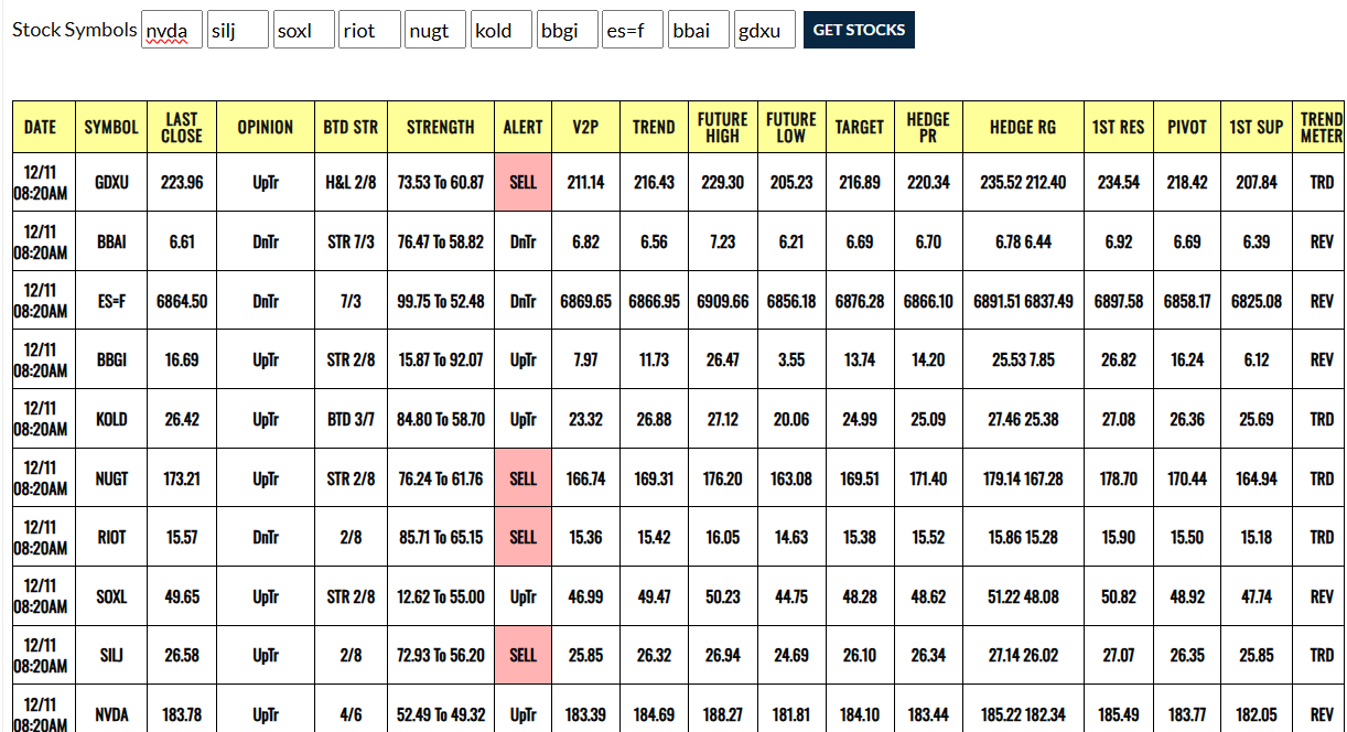 Our program uses a technical formula that analyzes the current and historical price activity to predict future price movements and identify high-probability trade entry and exit levels, providing investors and traders with a dynamic view of the market direction. We display each stock on a summary sheet, making it easy for the trader to view.
